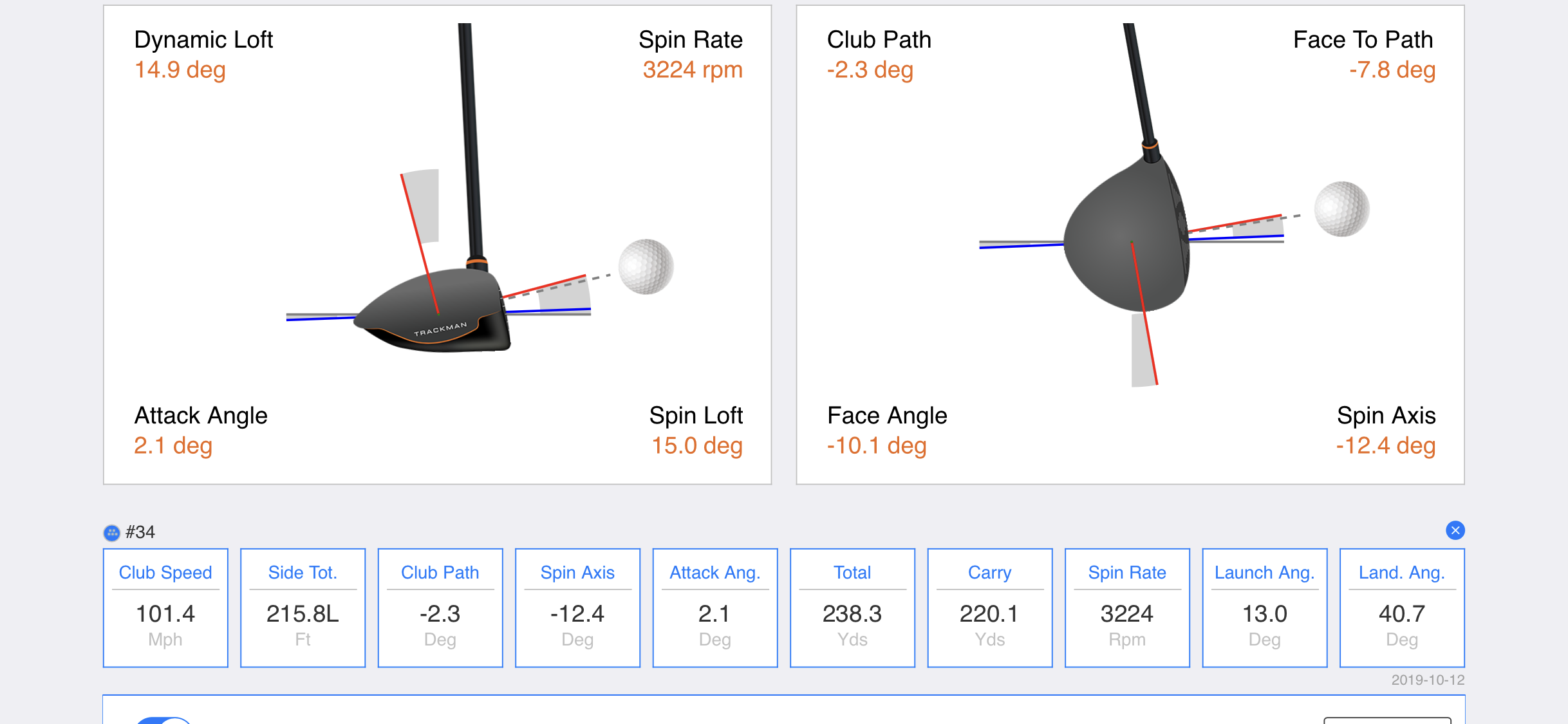 1. We set metrics for success. My angle of attack was around 6 degrees down and my club path was about 11 degrees to the left. My goal for the day was to get both numbers to zero or better (although the instructor recommended aiming for bigger shifts, since exaggeration is often the best way to counteract something).