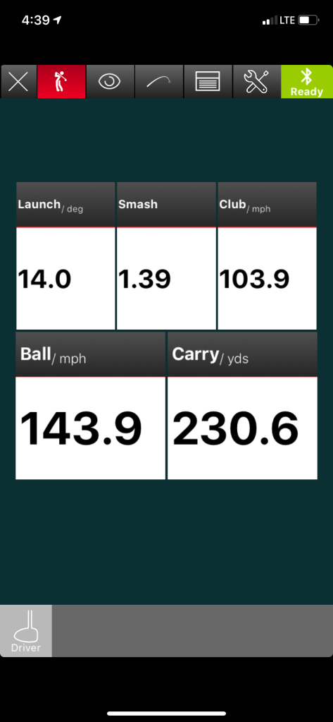 From there, I moved over to the range, where I concentrated on the shots I identified in the plan yesterday as essential. My driving was outstanding (See Flighscope data for best drive below). My 3-woods off the tee were pretty decent, and off the deck I made some progress in making better contact. Starting with short wedges definitely led to shorter, more efficient/on-plane swings. This translated to my 9-iron too, which, in my best swing, I was able to get to carry 124.4 yards with a 25-yard apex (and really nice feeling contact and a compact backswing). I didn’t bring my iPad for video today.